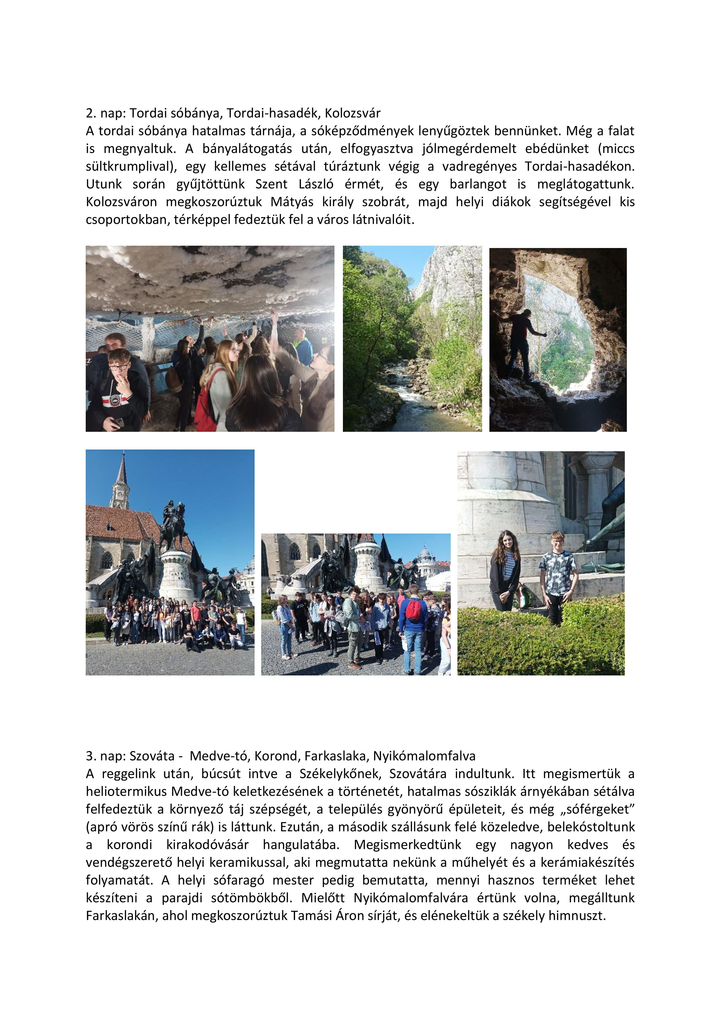 Aradon megkoszorúztuk a tizenhárom aradi vértanú tiszteletére emelt Szabadság emlékművet, megcsodáltuk Vajdahunyad várának csipkés tornyait, Gyulafehérváron tisztelegtünk nagy elődeink sírjánál, felfedeztük Segesvár híres épületeit egy térképes városnéző túrán. Lenyűgözött bennünket a Békás-szoros és a Gyilkos-tó látványa, Marosvásárhely történelmi épületei, a szovátai Medve-tó különleges atmoszférája. Megízleltük a tordai sót a sóbányában (megnyaltuk a falat), nagy élmény volt csónakázni a több száz méterrel a föld alatt elhelyezkedő tóban. Kolozsváron velünk egykorú diákok segítségével kutattuk fel a város nevezetességeit, Körösfőn a helyi református templomot csodálhattuk meg. Nagyváradon, a 20. század elejének egyik legjelentősebb kulturális központjában, Ady szavaival „Körös-parti Párizs”-ban megidéztük a kor pezsgő társadalmi-társasági életét; Nagyszalonta, Arany szülővárosa, a Csonka-torony pedig visszarepített bennünket rövid időre a 19. századba. A rengeteg élmény között meg kell említenünk az utolsó estére szervezett táncházat, ahol a bánfihunyadi néptáncegyüttes négy tagja mutatta meg nekünk a helyi népviseletet, és táncokat, majd mi is kipróbálhattuk mennyire vagyunk fogékonyak a néptáncra.(Volt,aki egész ügyesen ropta.)